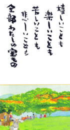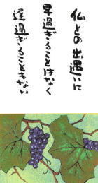 また、法語の文字も実に素晴らしい。手作りの絵に、これほど調和する文字があるだろうか。北海道書道展や毎日展でご活躍の覚英寺衆徒神保雨城氏の作品である。