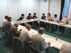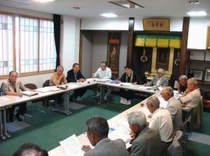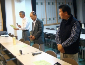 祝賀会の詩吟の練習をする河井氏・木村氏・恵美氏(左側より)