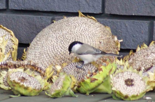 朝、ご本堂でお勤めをすませて、境内をながめると、久しぶりにたくさんの野鳥がにぎやかにさえずっていました。先日、大きくなったひまわりも花の時期が終わり、おもそうに下を向き始めたので、伐採し、玄関さきに種をお日様にあてて干していました。どうやら、それが目当てのようで、だいぶちらばっていました。外に出てカメラを構えていますと次々に小鳥が舞い降りてきては、一夜干しのひまわりの種をついばみ飛んでゆきました。
