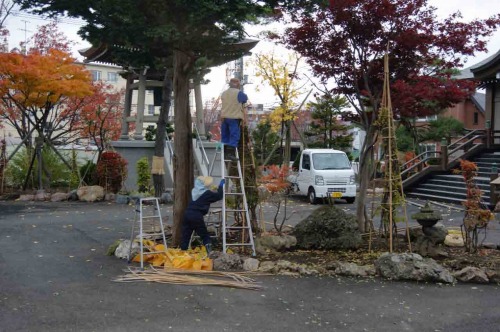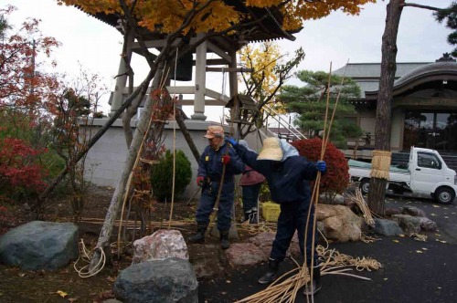 境内では雪囲いです。宮崎ご夫妻と木村婦人3名で低木を一本一本竹と縄で囲っていきます。重たい雪にも折れないよう、ツツジやさつきなど、一日がかりです。