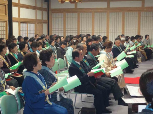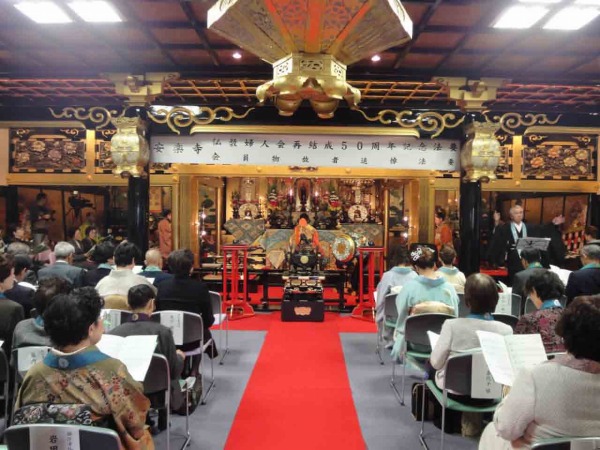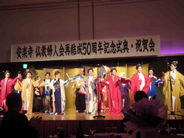 満堂のご本堂では50周年慶讃法要、そして会員物故者追悼法要が行われ、お念佛の声が御堂に響きわたりました。ありがたいことです。藤先生の記念布教の後、ホテルに移動し、式典・祝賀会でした。安楽寺様ならではの余興の楽しさと、会の絆の強さを感じる宴でした。