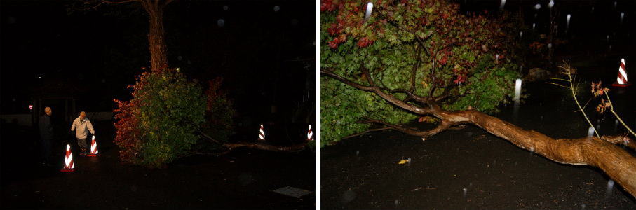 朝から荒れた天気になり、雪やみぞれも打ちつけ、特に風が強い一日になりました。午後5時過ぎ風の勢いが増して、風の音もはげしくなってきた時、寺務所の外で「ドン」と鈍い音が響きました。あわてて外を見ると、色づき始めた楓の木が、倒れているではありませんか。え~~っ!