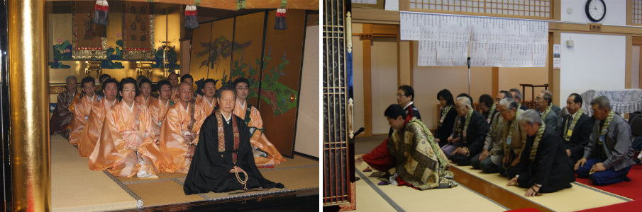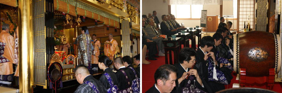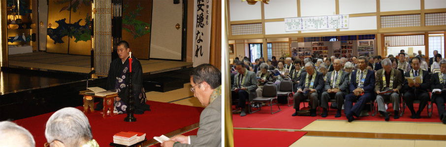 2日目の午後1時半より大逮夜法要では満堂の中、雅楽の演奏とともに、「浄土法事讃作法」により、修行されました。引き続き門信徒追悼会が行われ、一年間の物故者を追悼し、悲しみをご縁として、親鸞聖人のおすすめいただく、お念仏の世界と出会い、尊いいのちに出会えたことを、皆様とともに味あわさせていただきました。
