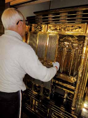 当日は住職さんと共においで下さり、吉田さんの指示の下、梱包も順序よく解かれ、入るかどうかと心配しておられましたが、まるで注文したようにピッタリ収まりました。住職さんの御手によりご絵像ご本尊脇掛と移され、仏具も収められお荘厳されました。