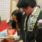 初参式のアルバムや絵本、合掌人形などの記念品を贈呈し、記念写真を撮り式は終わりました。写真も中々タイミングが難しいですね。我が子の視線が気になり、カメラを見ていない親御さんが、カメラマンに「おとうさん、おかあさん!お子さんを見ないでこちらを見てくださーい!」と (^^;)