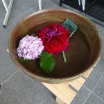 境内では紫陽花やダリアも満開になっています。総合玄関には水鉢を置きお花を浮かせてみました。どうぞお越し下さい。