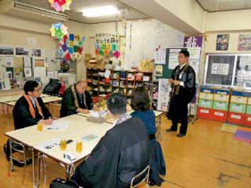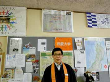 (下写真、住職の上方には眞願寺より2年前に送られた子供の寄せ書きが掲示されていました。)
