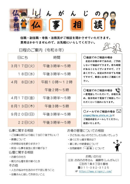 午後1時からの法要のご法話は一席とし、終了は2時半頃を予定します。午後1時半からの法要のご法話は一席とし、終了は3時頃を予定します。 各法要は、YouTubeとInstagramにてライブ配信を予定しています。 各法要に参拝の方は、マスク着用と手の消毒を宜しくお願いします。体調の悪い方や、咳や熱のある方は参拝をご遠慮いただきますようお願いします。